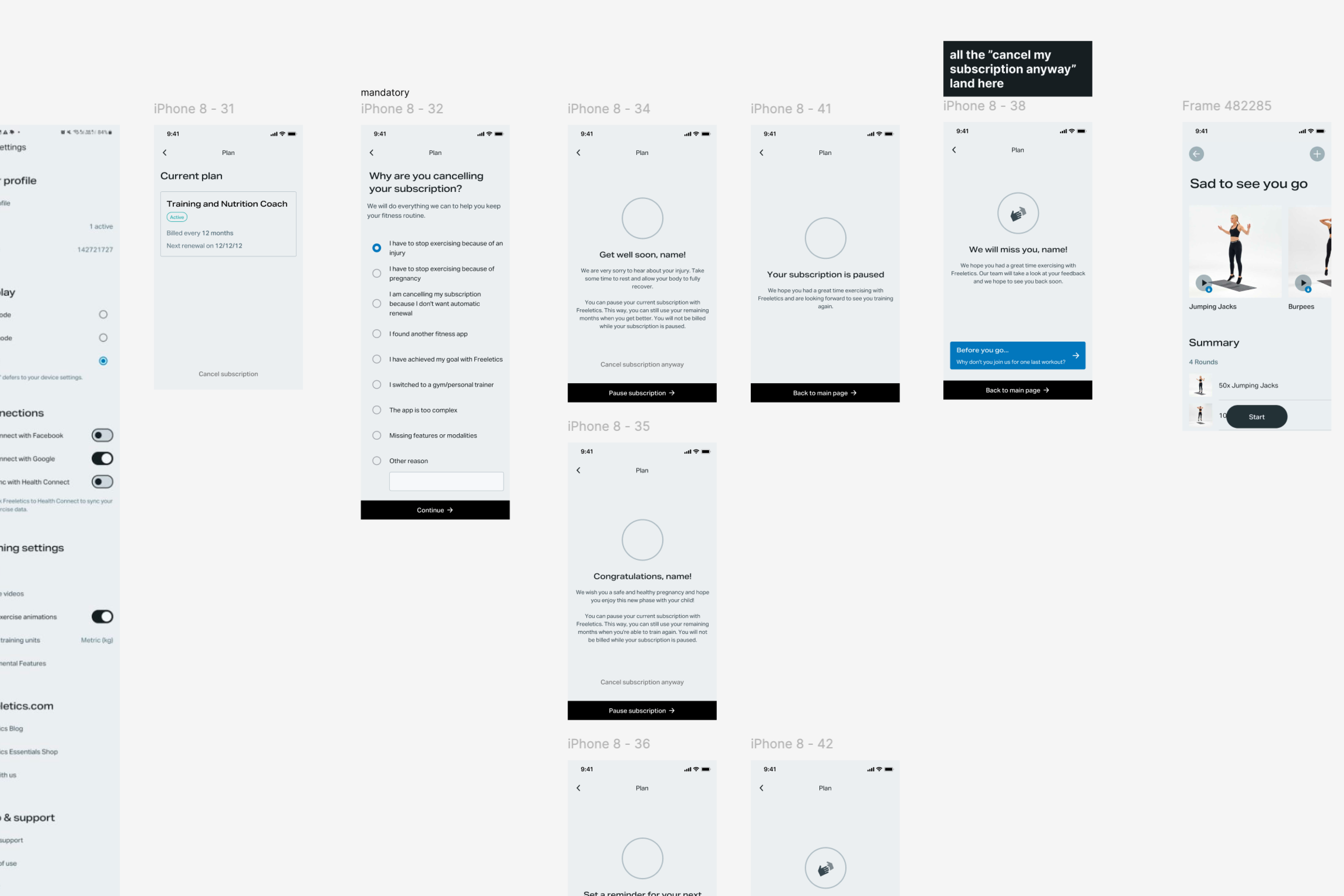 I redesigned the cancellation flow at Freeletics to make the process clearer, more transparent, and less frustrating for users. Based on real complaints, we added options like a subscription reminder and the ability to pause in specific cases.