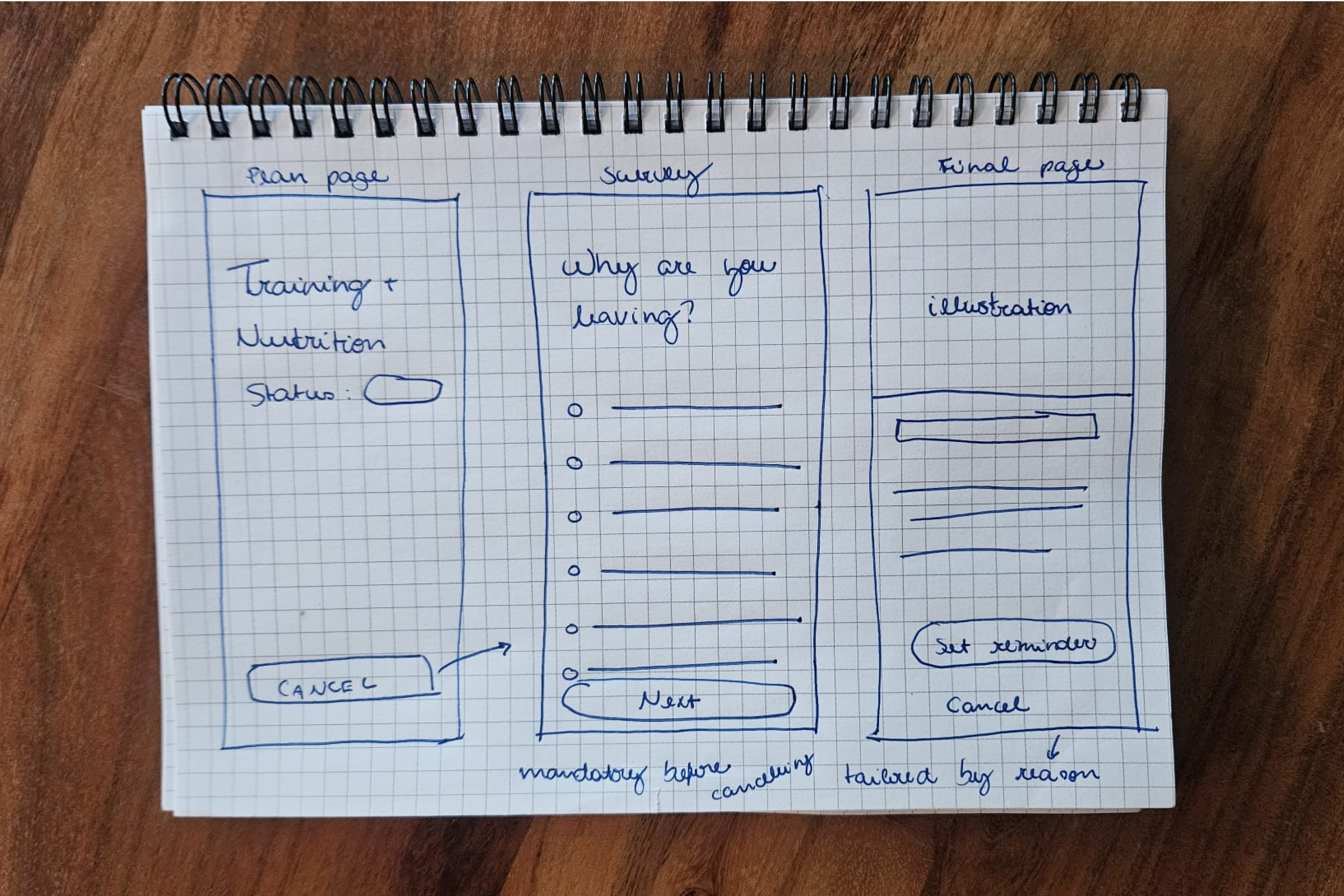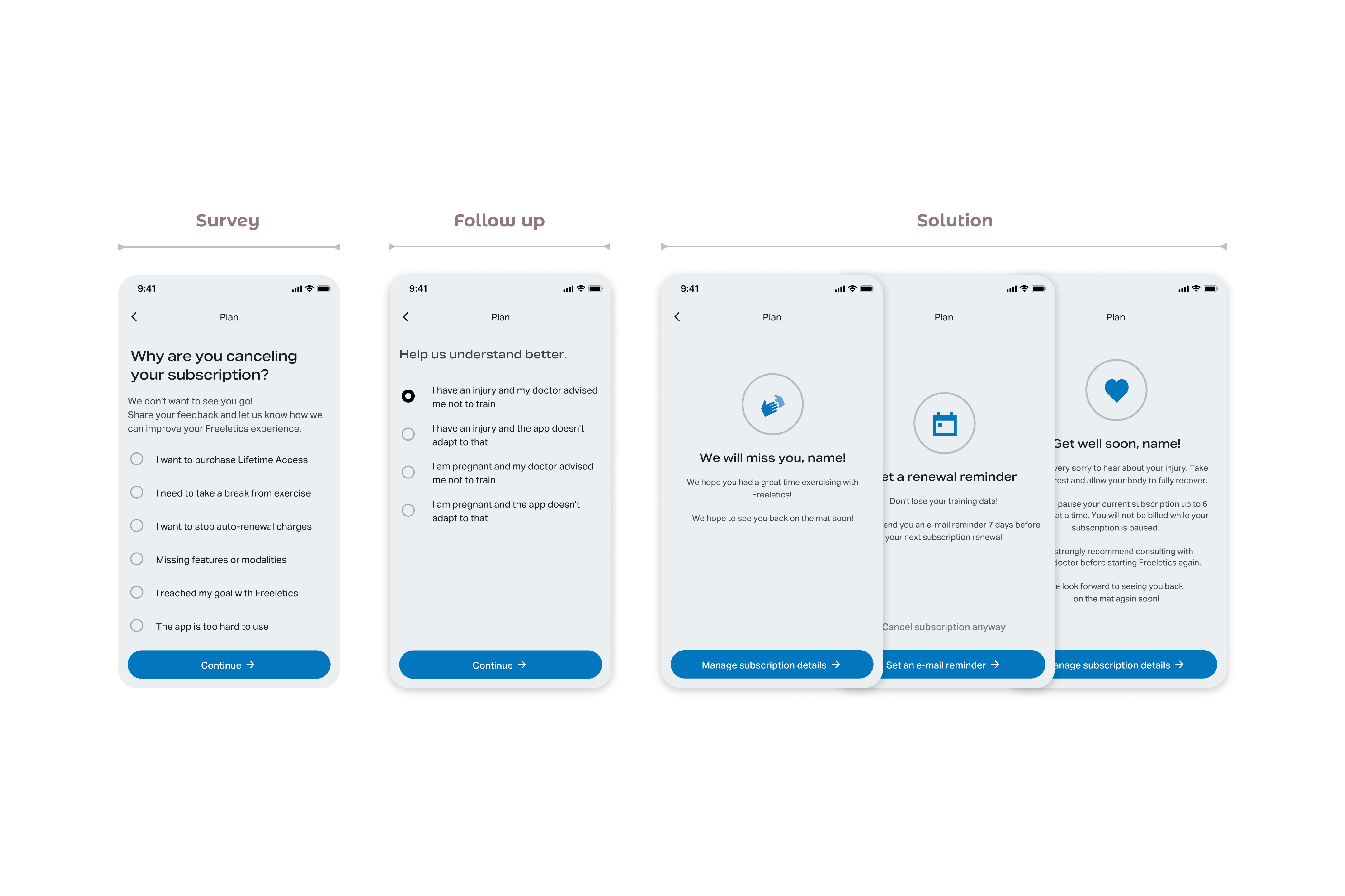After identifying the main reasons users were cancelling, I brought a proposal to the team: Start the cancellation flow with a short survey to gather more reliable data. This would help us better understand what users felt was missing and turn that into actionable insights. Right after completing the survey, users would land on a screen that addressed their specific concern. Wherever possible, we’d offer a solution to help them stay with Freeletics while still giving them the option to cancel if they chose to.