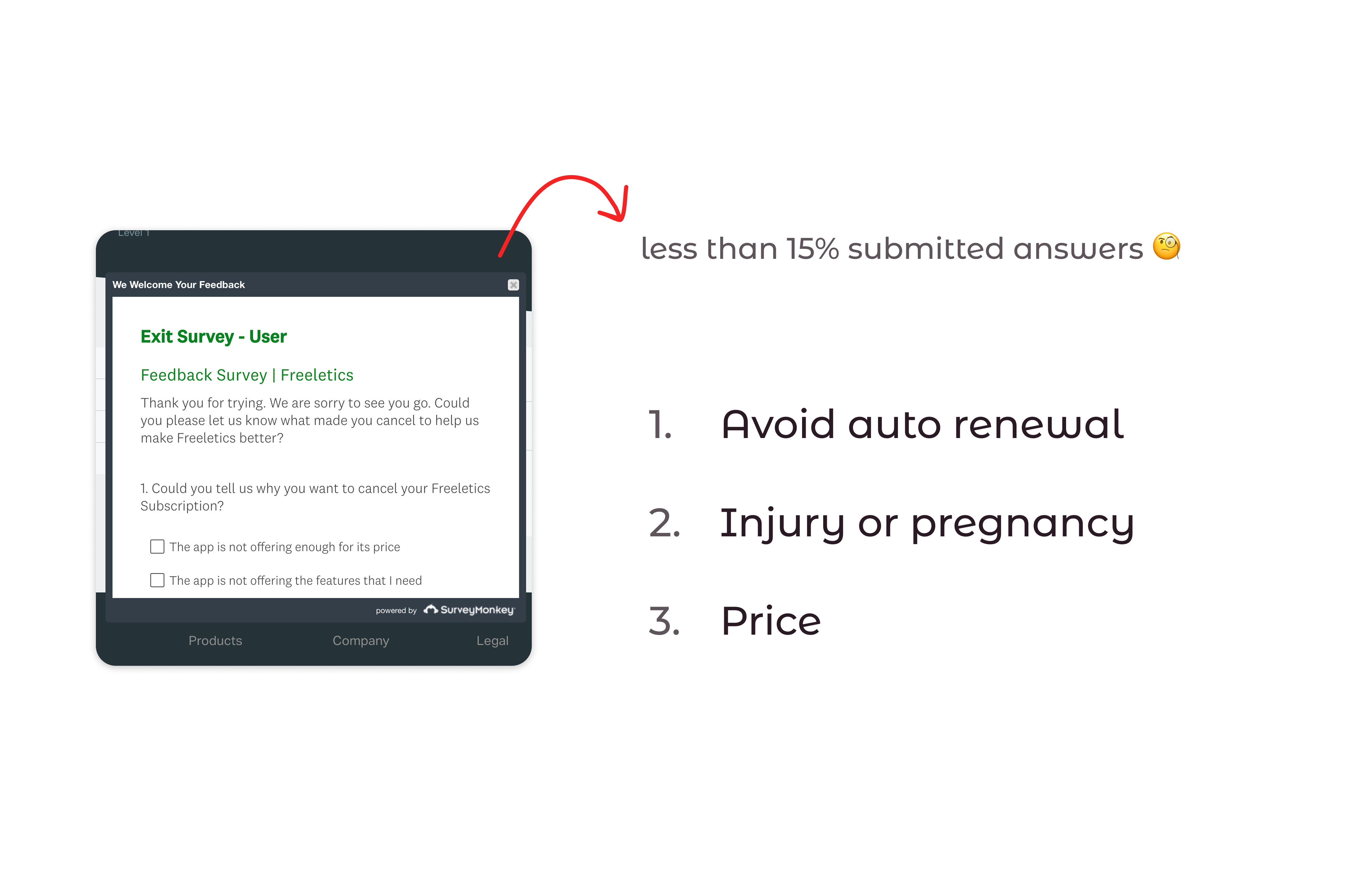 To understand why users were cancelling their subscriptions, I analyzed results from our ongoing Cancellation Survey — a SurveyMonkey pop-up that appears right after someone cancels via the website. While the data provided useful insights, it came with a catch: only a small percentage of users actually respond to it ( less than 15%), so results should be taken with a grain of salt.